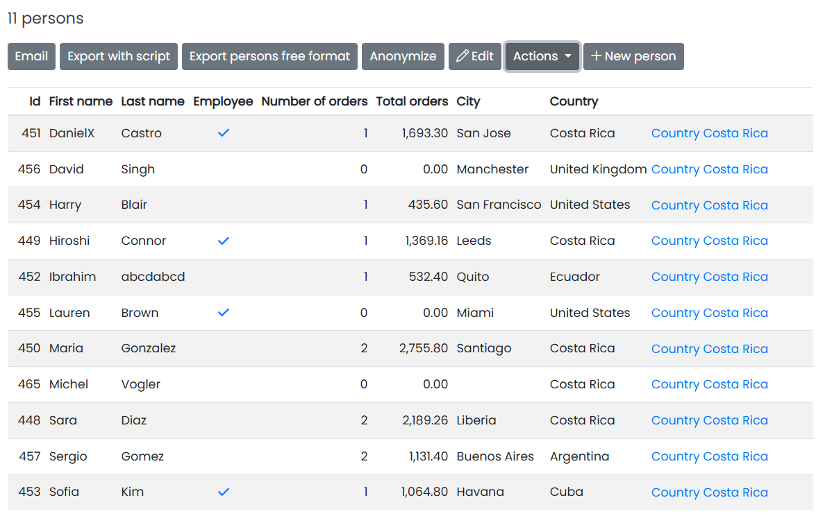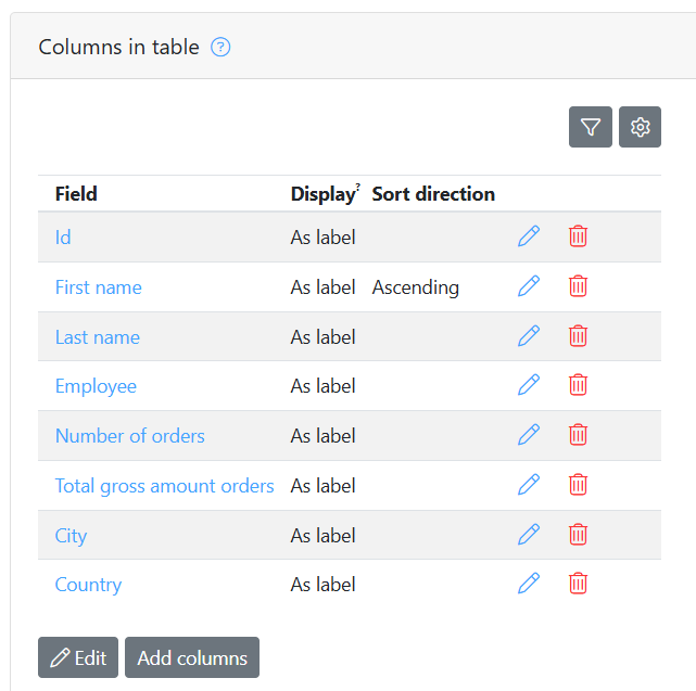 Go into edit mode to modify column properties or remove columns. Under "Display" select "as label" or "as link". By choosing "as label"  the field value will be displayed. By choosing "as link" a hyperlink to the foreign object is displayed (when the field has a foreign class). This makes it possible for users to jump to the foreign object directly instead of going to the details first. Below an example of what this looks like in the backstage: