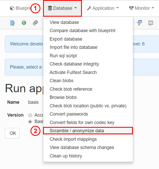 Application Management>>Application administration>>Database>>Scramble / anonymize data.