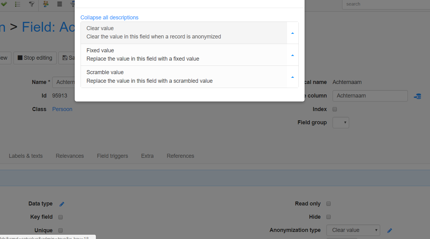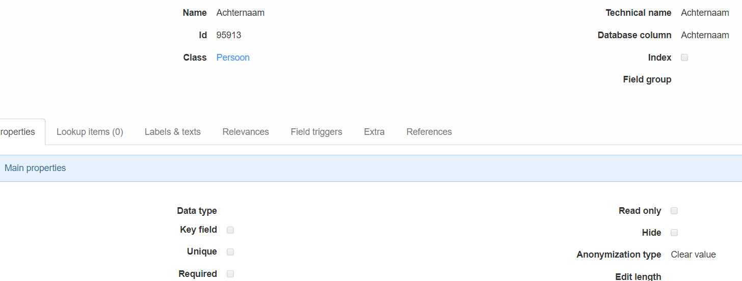 It is also possible to anonymize records in a batch process. For this you will have to define the Anonymization filter on the class of the records you want to anonymize. You will find this setting on the Relevance tab page of the class.