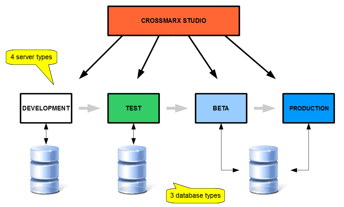 CrossmarX offers four types of servers to develop, test and run your applications. In a major project all server types will be used. In smaller projects some can be skipped.