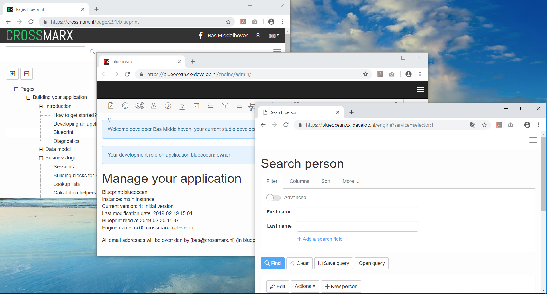 The CrossmarX studio is the main portal to your applications. Here, you can start new applications, and access the environment for development, testing and running your applications. All documentation about the platform can also be found here.